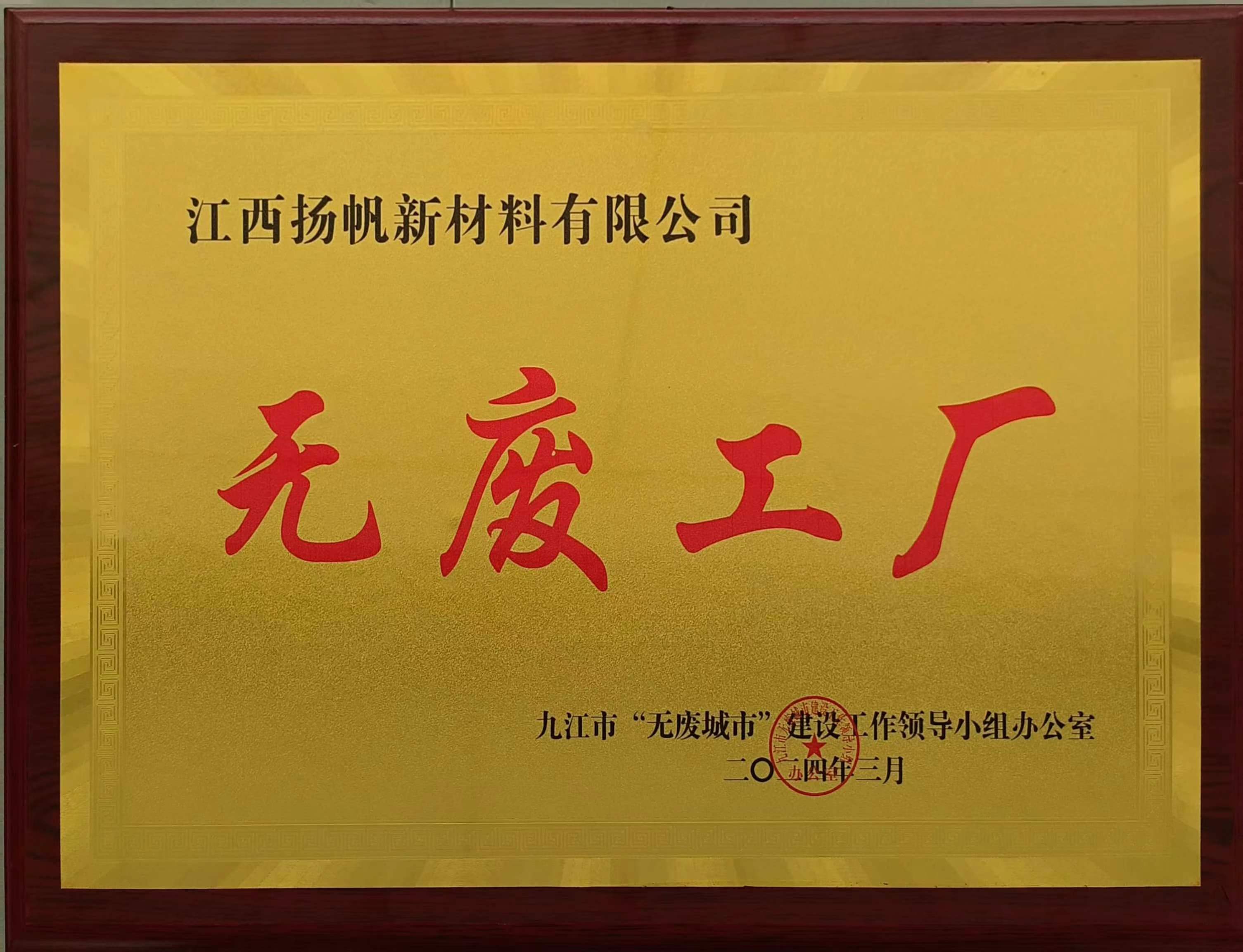 4月26日,九江市“無廢城市”建設(shè)工作領(lǐng)導小組辦公室授予江西揚帆新材料有限公司 “無廢工廠”稱號,標志著公司在廢物減排方面取得了顯著成果,并得到上級部門的認可和肯定。