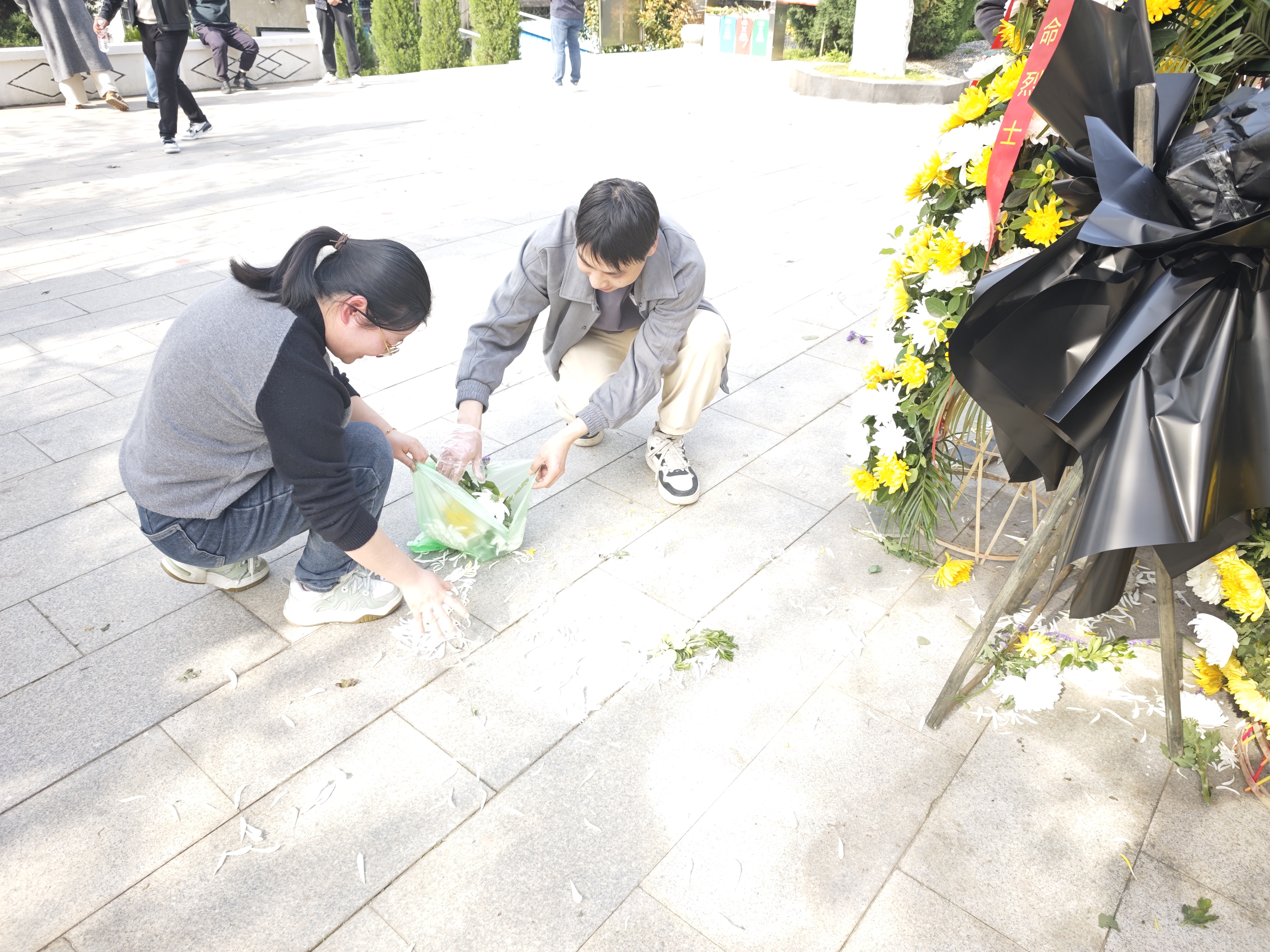 祭掃儀式結束后,大家化身“志愿守護者”,在陵園內開展義務清掃活動。大家手持掃把、垃圾袋,仔細清理陵園內的落花、枯葉、煙頭等雜物,以實際行動維護烈士陵園的整潔與莊嚴。經過大家的勞動,陵園環境煥然一新,所有人用汗水詮釋了對革命精神的傳承與踐行。